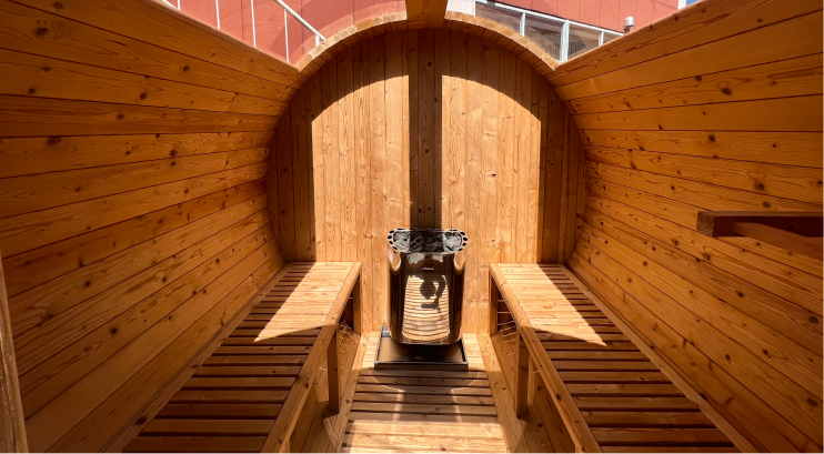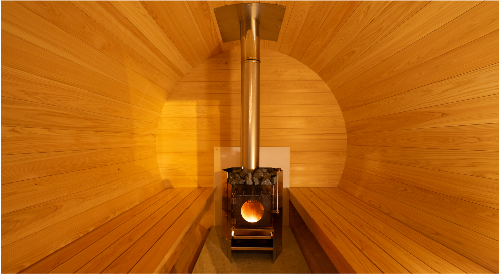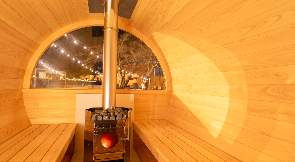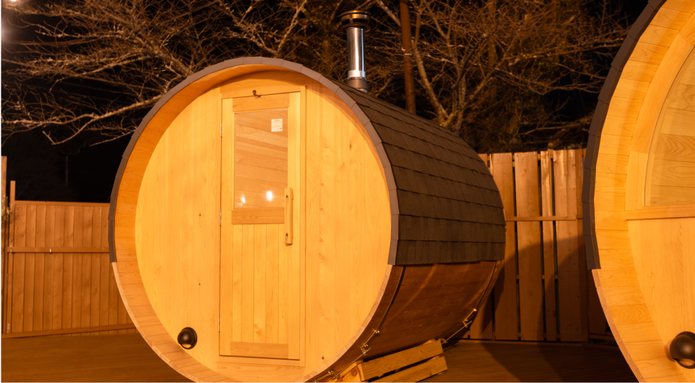 小型のバレルサウナは、定員は1〜4名で、天井に窓があり、青空や星空が楽しめます。温度は90~100度で、セルフロウリュも楽しめます。