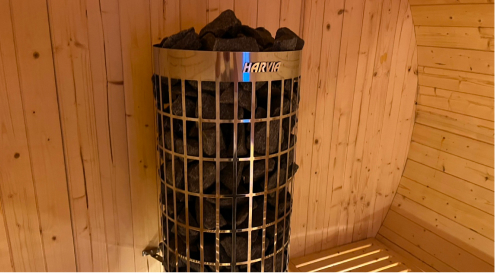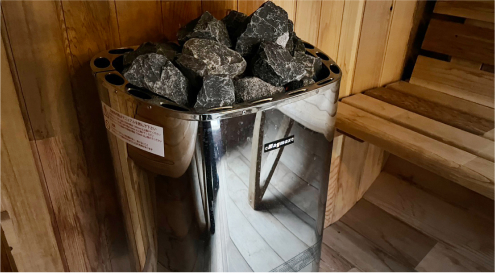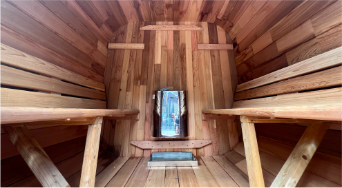 1~4名定員で入り口側がガラスとなっており、景色を眺めながらお過ごしいただけます。温度は90~100度で電気ストーブになります。セルフロウリュもお楽しみいただけます。