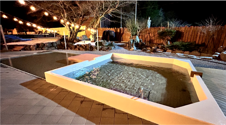 広い空と歴史のある金山を眺めたり。焚き火を囲みながらととのえる贅沢な空間。深さがが異なる2種の大きな水風呂は一つは120cmと60cm。水風呂のためにくみ上げた地下水はミネラルが多く温泉に近い成分が含まれます。
